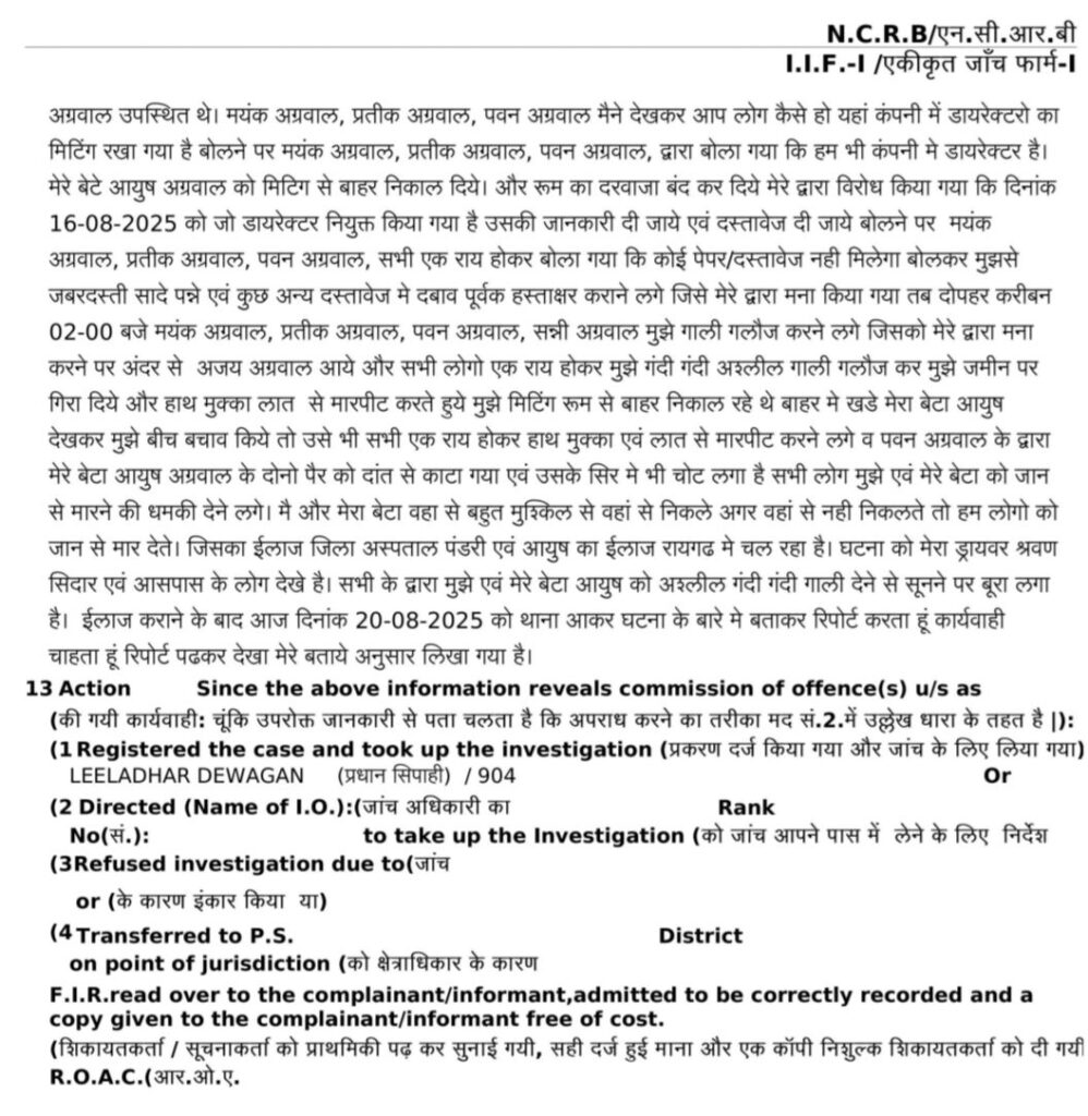 फिर दिनांक 16-08-2025 को सन्नी अग्रवाल के द्वारा मेल किया गया कि विडियो रिकार्डिंग एवं कंपनी सेकेटरी नियुक्त नहीं किया जा सकता लिखा गया। तब में एवं मेरा बेटा आयुष अग्रवाल दिनांक 17-08-2025 को दोपहर करीबन 01-30 बजे में तेलीबांधा सृष्टि गार्डन मकान नंबर 11 मे पहुंचे तो देखा वहां मयंक अग्रवाल, प्रतीक अग्रवाल, पवन अग्रवाल, सन्नी अग्रवाल एवं भोला प्रसाद मयंक अग्रवाल, प्रतीक अग्रवाल, पवन अग्रवाल उपस्थित थे।
