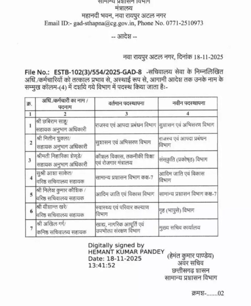 रायगढ़।सचिवालय सेवा के अधिकारियों-कर्मचारियों को तत्काल प्रभाव से इधर से उधर किया गया है। सूची में 15 के नाम शामिल है। यह लिस्ट सामान्य प्रशासन विभाग के अवर सचिव हेमंत कुमार पाण्डेय ने जारी किया है। नीचे देखें सूची…