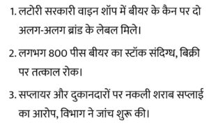 दरअसल, यह पूरा मामला लटोरी शराब का है। यहां नकली बीयर सप्लाई की जा रही थी। यहा बेचे जा रहे बीयर के कैन पर दो-दो अलग ब्रांड के लेबल लगे हुए थे!