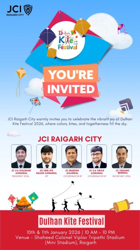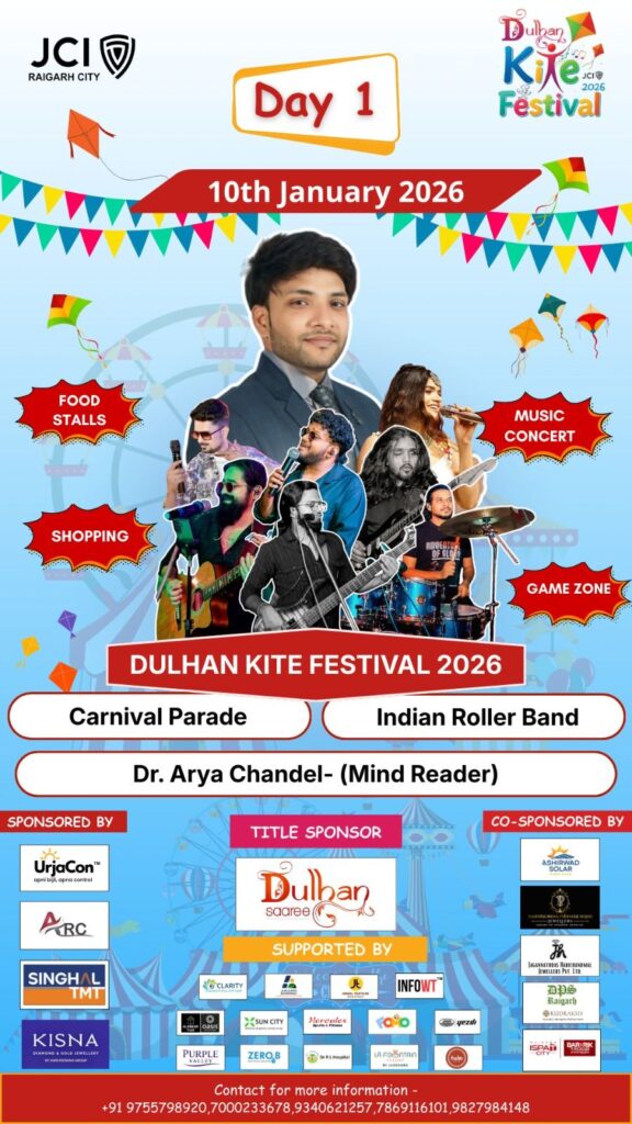 рд░рд╛рдпрдЧрдврд╝редрдЬреЗрд╕реАрдЖрдИ (рдЬреВрдирд┐рдпрд░ рдЪреЗрдВрдмрд░ рдЗрдВрдЯрд░рдиреЗрд╢рдирд▓) рд░рд╛рдпрдЧрдврд╝ рдХреЗ рддрддреНрд╡рд╛рд╡рдзрд╛рди рдореЗрдВ рд╢рд╣рд░ рдореЗрдВ рджреЛ рджрд┐рд╡рд╕реАрдп рдХрд╛рдЗрдЯ рдлреЗрд╕реНрдЯрд┐рд╡рд▓ рдХрд╛ рднрд╡реНрдп рдЖрдпреЛрдЬрди рдХрд┐рдпрд╛ рдЬрд╛ рд░рд╣рд╛ рд╣реИредрдпрд╣ рд░рдВрдЧрд╛рд░рдВрдЧ рдЙрддреНрд╕рд╡ 10 рдЬрдирд╡рд░реА рд╕реЗ рдкреНрд░рд╛рд░рдВрдн рд╣реЛрдХрд░ 11 рдЬрдирд╡рд░реА рддрдХ рдЪрд▓реЗрдЧрд╛ред рдЖрдпреЛрдЬрди рдХреЛ рд▓реЗрдХрд░ рд╢рд╣рд░рд╡рд╛рд╕рд┐рдпреЛрдВ рдореЗрдВ рдЦрд╛рд╕рд╛ рдЙрддреНрд╕рд╛рд╣ рджреЗрдЦрд╛ рдЬрд╛ рд░рд╣рд╛ рд╣реИред