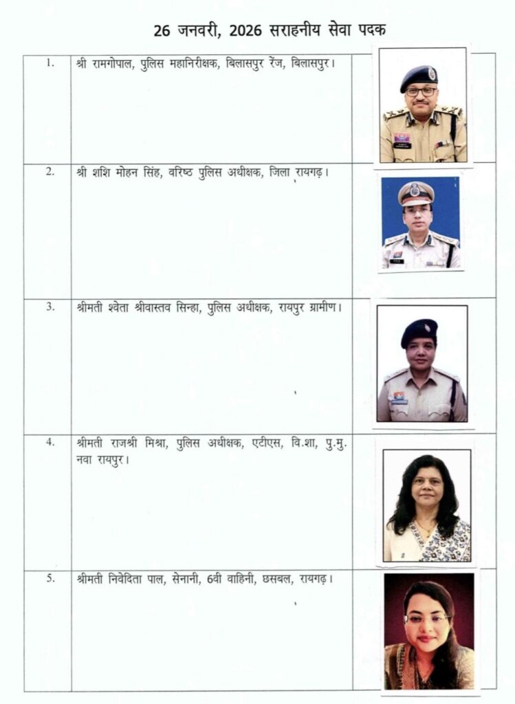 рднрд╛рд░рдд рд╢рд╛рд╕рди,рдЧреГрд╣ рдордВрддреНрд░рд╛рд▓рдп, рдирдИ рджрд┐рд▓реНрд▓реА рд╕реЗ рдкреНрд░рд╛рдкреНрдд рдЬрд╛рдирдХрд╛рд░реА рдХреЗ рдЕрдиреБрд╕рд╛рд░ рдЧрдгрддрдВрддреНрд░ рджрд┐рд╡рд╕ 2026 рдХреЗ рдЕрд╡рд╕рд░ рдкрд░ рдорд╣рд╛рдорд╣рд┐рдо рд░рд╛рд╖реНрдЯреНрд░рдкрддрд┐ рджреНрд╡рд╛рд░рд╛ рдЫрддреНрддреАрд╕рдЧрдврд╝ рдкреБрд▓рд┐рд╕ рд╡рд┐рднрд╛рдЧ рдХреЗ рдЕрдзрд┐рдХрд╛рд░рд┐рдпреЛрдВ рдПрд╡рдВ рдХрд░реНрдордЪрд╛рд░рд┐рдпреЛрдВ рдХреЛ рд╡реАрд░рддрд╛, рд╡рд┐рд╢рд┐рд╖реНрдЯ рд╕реЗрд╡рд╛ рдПрд╡рдВ рд╕рд░рд╛рд╣рдиреАрдп рд╕реЗрд╡рд╛ рдкрджрдХ рд╕реЗ рд╕рдореНрдорд╛рдирд┐рдд рдХрд░рдиреЗ рдХреА рдШреЛрд╖рдгрд╛ рдХреА рдЧрдИ рд╣реИред рдпрд╣ рд╕рдореНрдорд╛рди рдЫрддреНрддреАрд╕рдЧрдврд╝ рдкреБрд▓рд┐рд╕ рдХреА рдХрд░реНрддрд╡реНрдпрдирд┐рд╖реНрдард╛, рд╕рд╛рд╣рд╕ рдФрд░ рдЙрддреНрдХреГрд╖реНрдЯ рд╕реЗрд╡рд╛рдУрдВ рдХрд╛ рдкреНрд░рддреАрдХ рд╣реИред