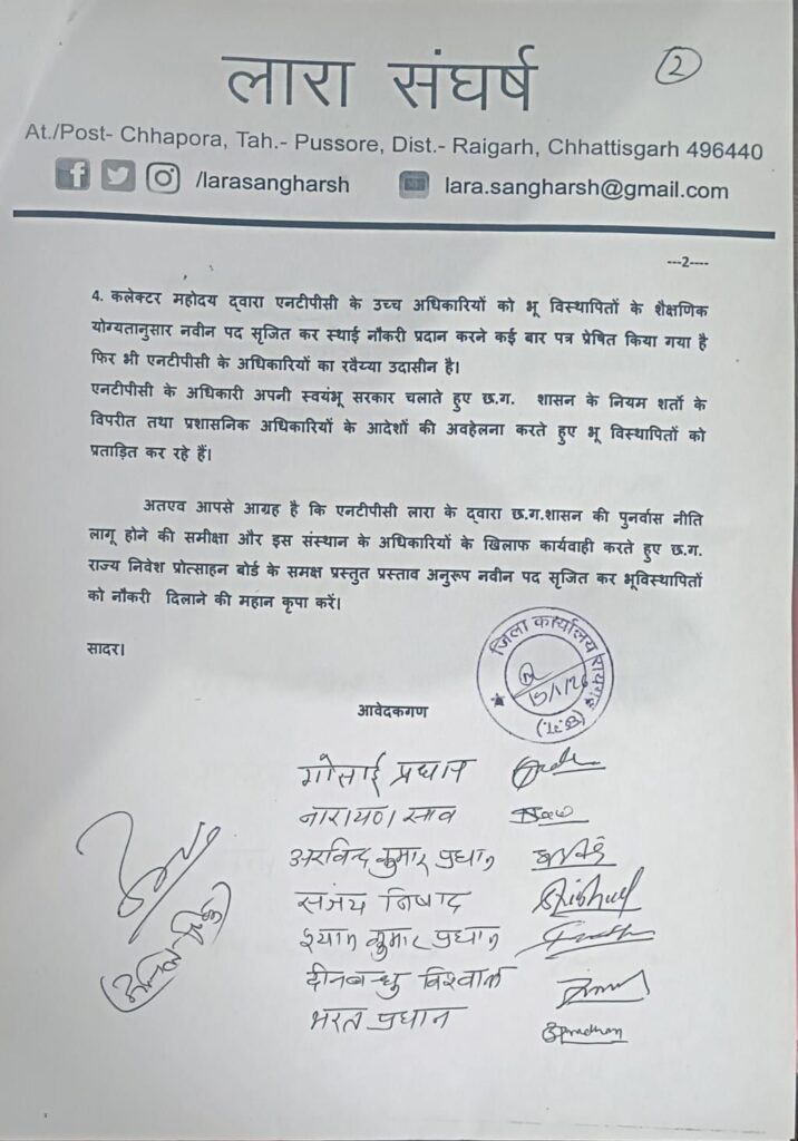 लारा संघर्ष के बैनर तले अनिल चीकू, अरविंद कुमार प्रधान, हरिकिशन पटेल, नारायण साव, मुरली थवाईत, कौशिक गुप्ता सहित अन्य प्रतिनिधियों ने कलेक्टर मयंक चतुर्वेदी से मुलाकात कर ज्ञापन सौंपा। प्रतिनिधिमंडल ने आरोप लगाया कि एनटीपीसी लारा परियोजना के तहत पुसौर ब्लॉक के लारा, कांदागढ़, लोहाखान, बोड़ाझरिया, छपोरा, आरमुड़ा, देवलसुर्रा, झिलंगिटार सहित कई गांवों की हजारों एकड़ जमीन वर्ष 2011 में जिला प्रशासन के माध्यम से अधिग्रहित की गई थी।