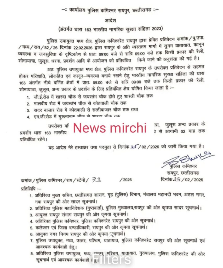 рд░рд╛рдпрдЧрдврд╝редрд░рд╛рдЬрдзрд╛рдиреА рд░рд╛рдпрдкреБрд░ рдореЗрдВ рдпрд╛рддрд╛рдпрд╛рдд рд╡реНрдпрд╡рд╕реНрдерд╛ рдХреЛ рд╕реБрдЪрд╛рд░реБ рд░рдЦрдиреЗ рдФрд░ рдХрд╛рдиреВрди-рд╡реНрдпрд╡рд╕реНрдерд╛ рдмрдирд╛рдП рд░рдЦрдиреЗ рдХреЗ рдЙрджреНрджреЗрд╢реНрдп рд╕реЗ рдкреБрд▓рд┐рд╕ рдкреНрд░рд╢рд╛рд╕рди рдиреЗ рдорд╣рддреНрд╡рдкреВрд░реНрдг рдХрджрдо рдЙрдард╛рдпрд╛ рд╣реИред рдкреБрд▓рд┐рд╕ рдЙрдкрд╛рдпреБрдХреНрдд, рдордзреНрдп рдХреНрд╖реЗрддреНрд░ рджреНрд╡рд╛рд░рд╛ рдкреНрд░рд╕реНрддреБрдд рдкреНрд░рддрд┐рд╡реЗрджрди рдХреЗ рдЖрдзрд╛рд░ рдкрд░ рдкреБрд▓рд┐рд╕ рдХрдорд┐рд╢реНрдирд░ рдиреЗ рднрд╛рд░рддреАрдп рдирд╛рдЧрд░рд┐рдХ рд╕реБрд░рдХреНрд╖рд╛ рд╕рдВрд╣рд┐рддрд╛ рдХреА рдзрд╛рд░рд╛ 163 рдХреЗ рдЕрдВрддрд░реНрдЧрдд рд╢рд╣рд░ рдХреЗ рдЕрддрд┐ рд╡реНрдпрд╕реНрддрддрдо рдорд╛рд░реНрдЧреЛрдВ рдкрд░ рд░реИрд▓реА, рд╢реЛрднрд╛рдпрд╛рддреНрд░рд╛, рдЬреБрд▓реВрд╕, рдзрд░рдирд╛ рдФрд░ рдЕрдиреНрдп рдкреНрд░рдХрд╛рд░ рдХреЗ рдкреНрд░рджрд░реНрд╢рдиреЛрдВ рдкрд░ рдкреНрд░рддрд┐рдмрдВрдз рд▓рд╛рдЧреВ рдХрд░ рджрд┐рдпрд╛ рд╣реИред
