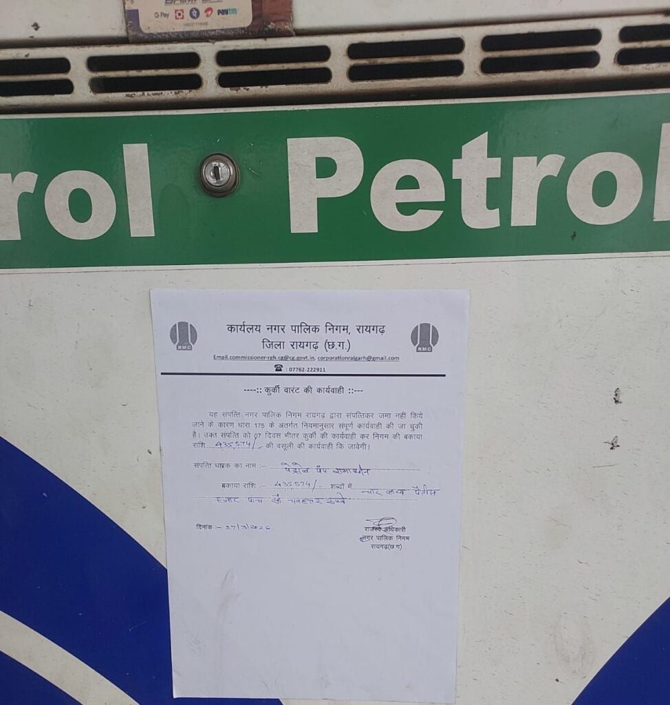रायगढ़। नगर निगम द्वारा प्रॉपर्टी टैक्स वसूली को लेकर चलाए जा रहे विशेष अभियान के तहत बड़ी कार्रवाई करते हुए उर्दना स्थित रामाधीन पेट्रोल पंप को सील कर दिया गया। निगम की इस कार्रवाई से शहर के अन्य बकायेदारों में हड़कंप मच गया है।