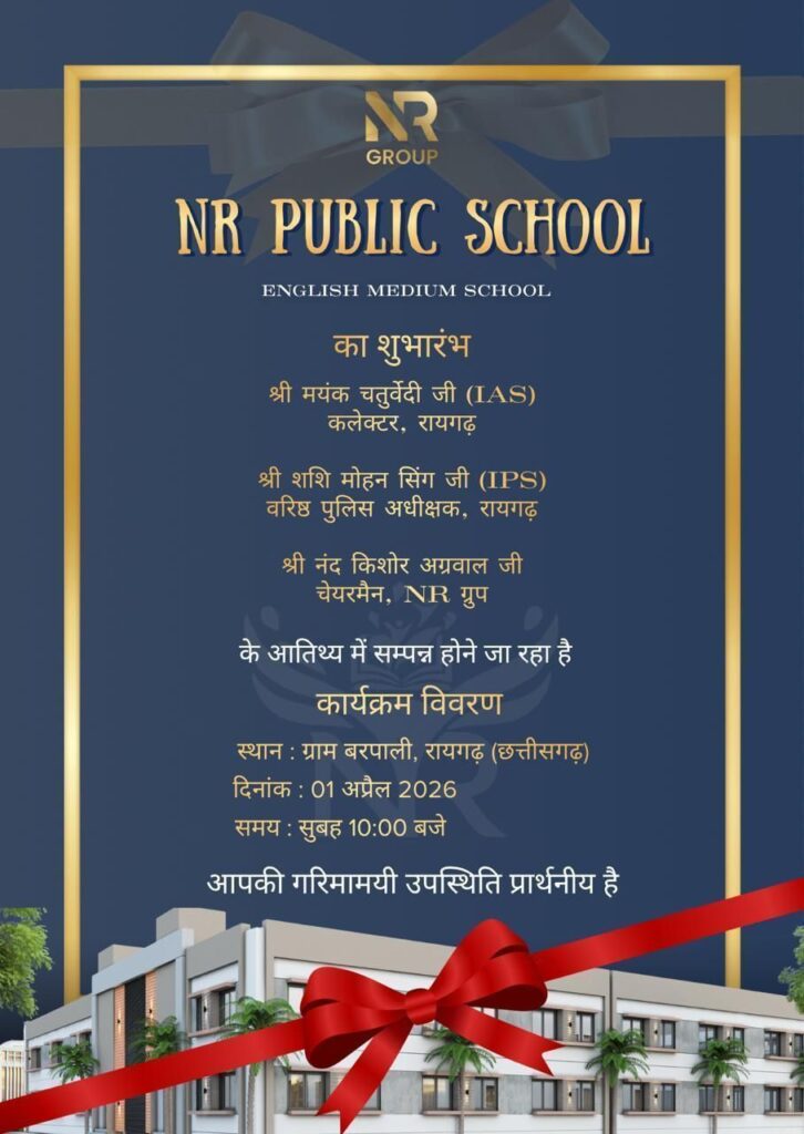 रायगढ़।औद्योगिक क्षेत्र में अग्रणी भूमिका निभाने वाला एनआर ग्रुप अब शिक्षा के क्षेत्र में भी अपनी मजबूत उपस्थिति दर्ज कराने जा रहा है। समूह द्वारा ग्राम बरपाली में “एनआर पब्लिक स्कूल” की शुरुआत की जा रही है, जिसका भव्य शुभारंभ बुधवार सुबह 10 बजे किया जाएगा।