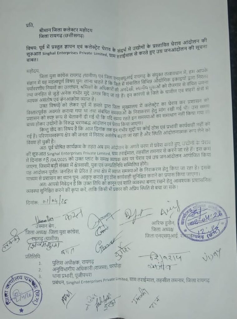 रायगढ़। जिले में संचालित औद्योगिक इकाइयों के खिलाफ स्थानीय रोजगार, पर्यावरण प्रदूषण, श्रमिक सुरक्षा और जनहित से जुड़े मुद्दों को लेकर अब आंदोलन और तेज होने जा रहा है। जिला युवा कांग्रेस (ग्रामीण) अध्यक्ष उस्मान बेग एवं जिला एनएसयूआई अध्यक्ष आरिफ हुसैन के नेतृत्व में आंदोलन के अगले चरण की शुरुआत 08 अप्रैल को ग्राम तराईमाल स्थित सिंघल एंटरप्राइजेज प्राइवेट लिमिटेड प्लांट के घेराव से की जाएगी।