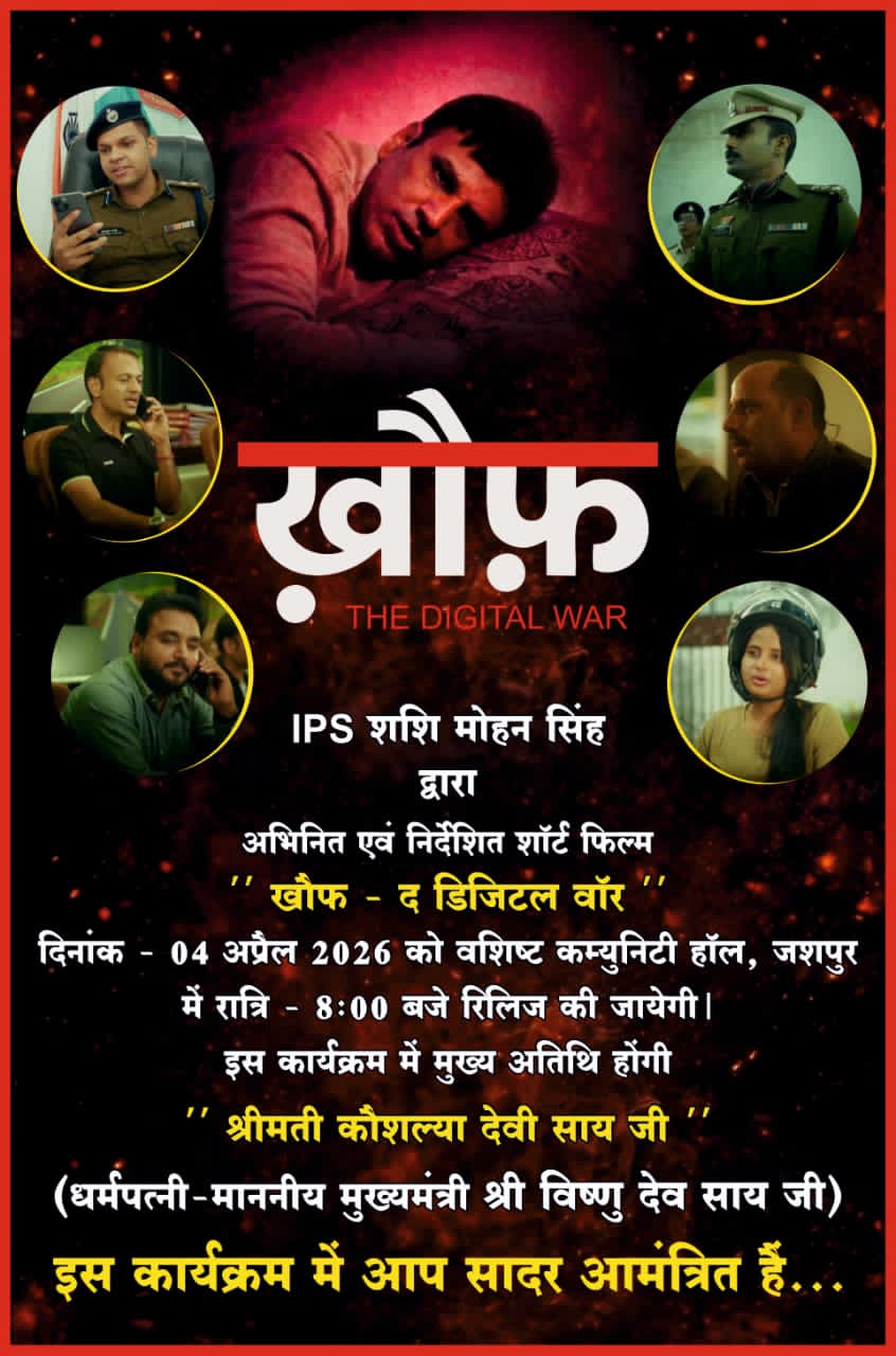 рд░рд╛рдпрдЧрдврд╝!рдЫрддреНрддреАрд╕рдЧрдврд╝ рдореЗрдВ рдмрдврд╝рддреЗ рд╕рд╛рдЗрдмрд░ рдЕрдкрд░рд╛рдзреЛрдВ рдХреЗ рдЦрд┐рд▓рд╛рдл рдЬрд╛рдЧрд░реВрдХрддрд╛ рдХреА рджрд┐рд╢рд╛ рдореЗрдВ рдПрдХ рдмрдбрд╝реА рдкрд╣рд▓ рдХрд░рддреЗ рд╣реБрдП рд░рд╛рдпрдЧрдврд╝ рдХреЗ рдПрд╕рдПрд╕рдкреА рд╢рд╢рд┐ рдореЛрд╣рди рд╕рд┐рдВрд╣ рджреНрд╡рд╛рд░рд╛ рд▓рд┐рдЦрд┐рдд, рдирд┐рд░реНрджреЗрд╢рд┐рдд рдФрд░ рдЕрднрд┐рдиреАрдд рдмрд╣реБрдкреНрд░рддреАрдХреНрд╖рд┐рдд рд╢реЙрд░реНрдЯ рдлрд┐рд▓реНрдо тАЬрдЦрд╝реМрдлрд╝ – рдж рдбрд┐рдЬрд┐рдЯрд▓ рд╡реЙрд░тАЭ рдХрд╛ рдЖрдЬ 4 рдЕрдкреНрд░реИрд▓ рдХреЛ рдЬрд╢рдкреБрд░ рдХреЗ рд╡рд┐рд╢рд┐рд╖реНрдЯ рдХрдореНрдпреБрдирд┐рдЯреА рд╣реЙрд▓ рдореЗрдВ рд░рд╛рддреНрд░рд┐ 8 рдмрдЬреЗ рднрд╡реНрдп рд╡рд┐рдореЛрдЪрди рдХрд┐рдпрд╛ рдЬрд╛рдПрдЧрд╛ред
