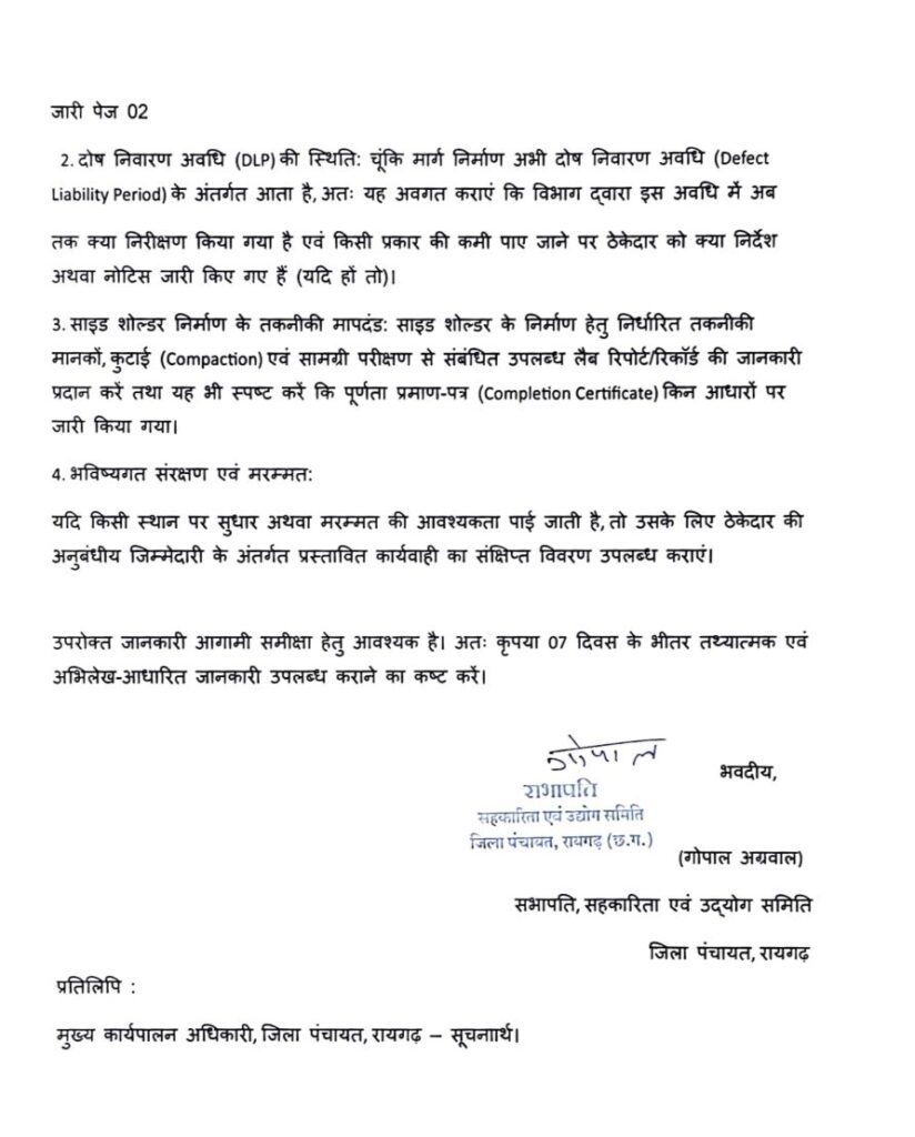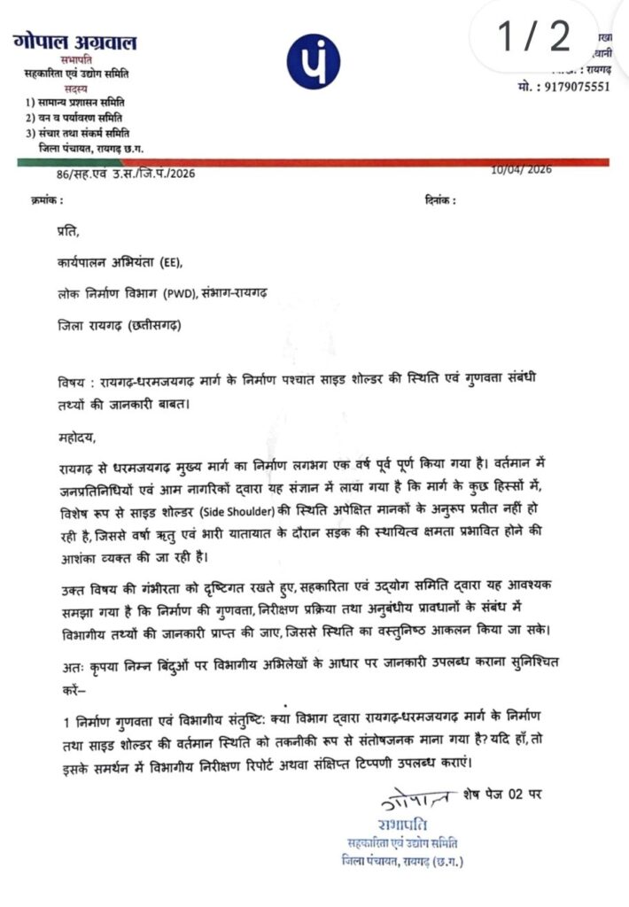 रायगढ़-धरमजयगढ़ मुख्य मार्ग के साइड शोल्डर (Side Shoulder) की गुणवत्ता को लेकर अब जिला पंचायत रायगढ़ ने कड़ा रुख अपना लिया है। जिला पंचायत की सहकारिता एवं उद्योग समिति के सभापति गोपाल अग्रवाल ने इस मुद्दे को गंभीरता से लेते हुए लोक निर्माण विभाग (PWD) रायगढ़ संभाग के कार्यपालन अभियंता को पत्र जारी कर 7 दिनों के भीतर विस्तृत जवाब तलब किया है।